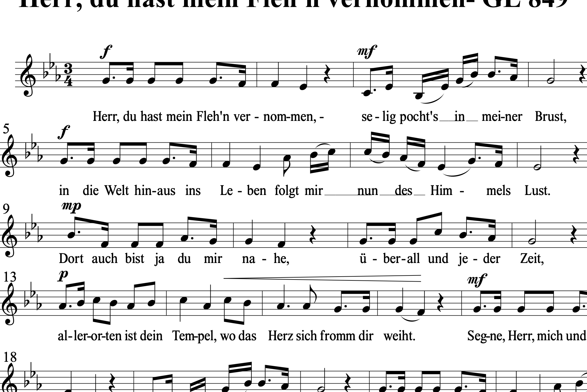 Bläsersätze incl Intonation sollten geschrieben werden für "Wohin soll ich mich wenden - GL 842 ff" (Schubert), "Hier liegt vor deiner Majestät - GL932 ff" (Haydn), "Hier steh'n wir, Herr - Die Kleine Messe" (Thoma), "Missa mundi" (GL 401 usw), ...