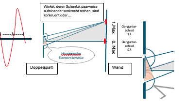 • Ergebnis: Das Interferenzmuster ist ein Ergebnis der Welle, die durch beide Spalte geht; wird die Ortsinformation gemessen, kollabiert diese Wellenfunktion.