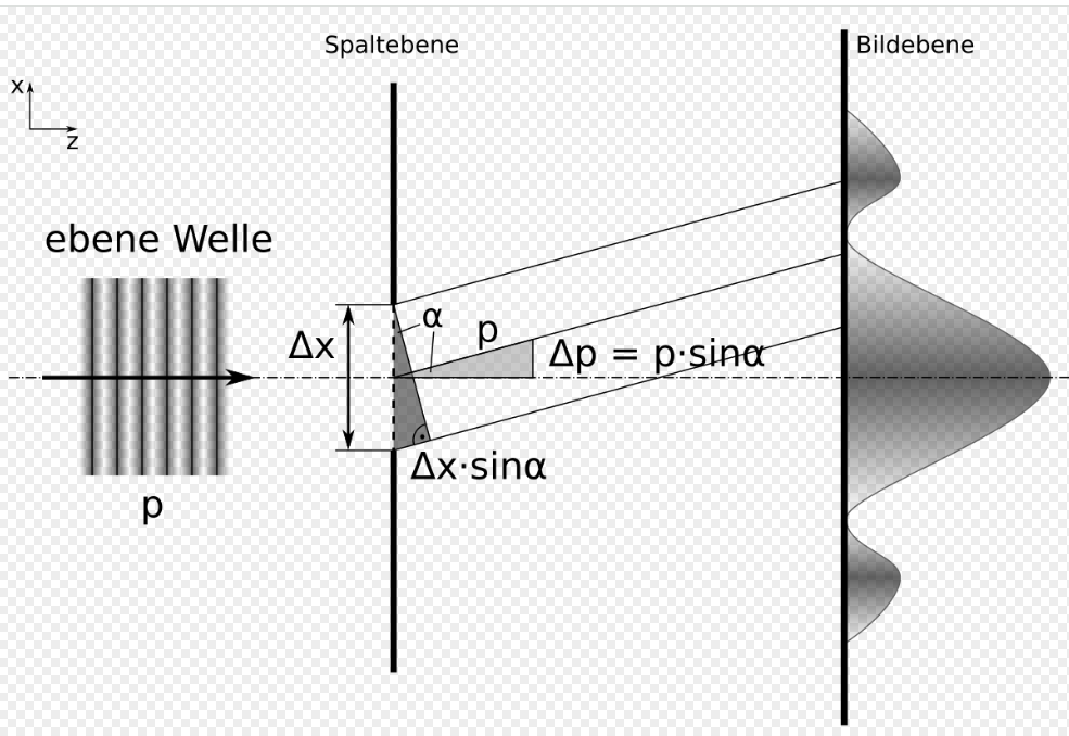 • Es werden gemäß Heisenberg nur die Teilchen im Hauptmaximum des gebeugten Strahls betrachtet. Ihre Ablenkungswinkel α entsprechen einem Impuls in x-Richtung, der innerhalb des vorgegebenen Impulsintervalls Δp (keine Zufallsgröße) des ersten Beugungsminimums auf der Impulsskala liegt. Formal sind das genau die, die der folgenden Bedingung genügen: